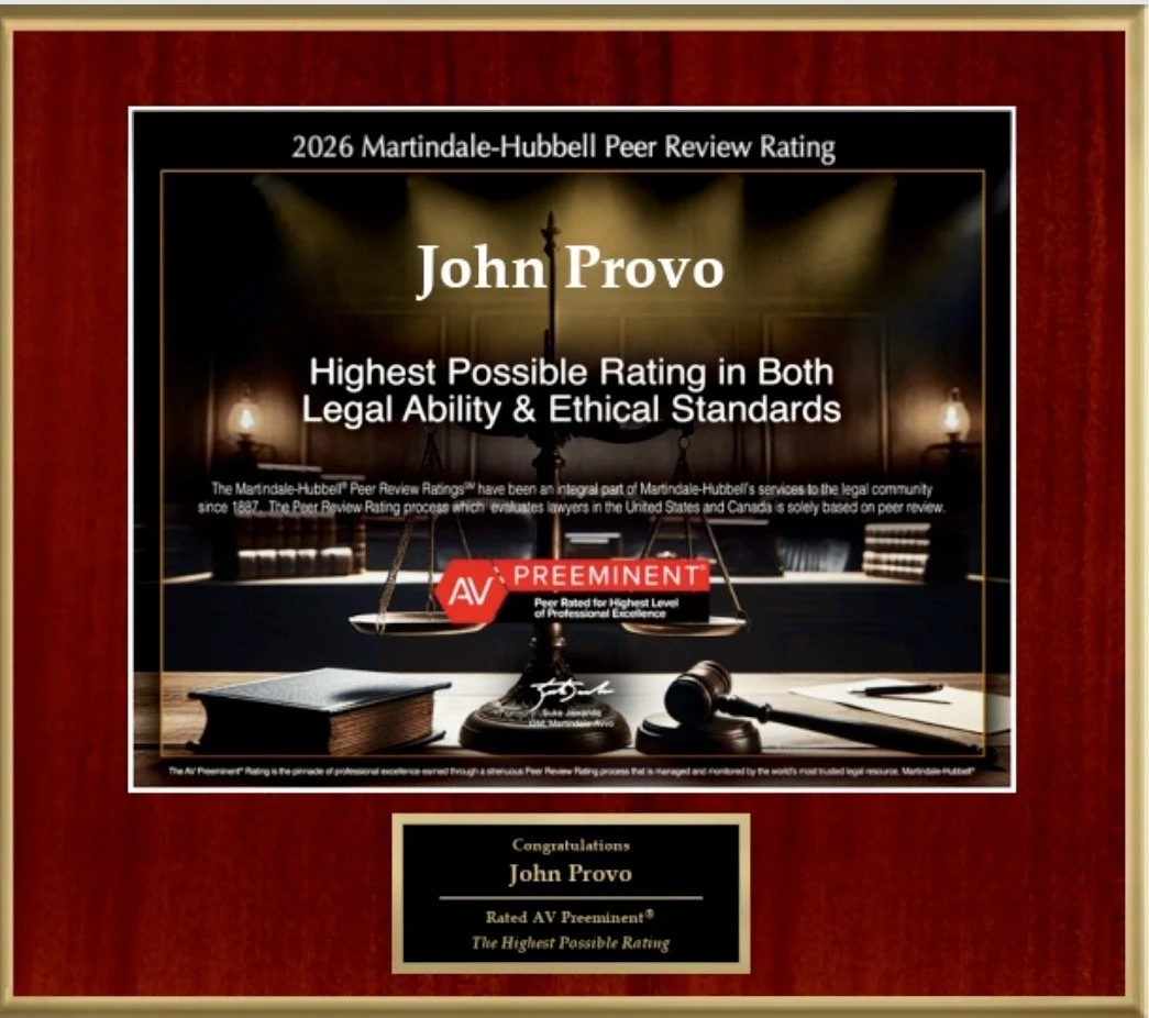 Martindale-Hubbell, an independent service that has rated attorneys nationwide for more than a century, has recognized John Provo with its “AV Preeminent®” rating for 2024. An “AV Preeminent” rating is only given to attorneys ranked at the highest level of professional excellence for their legal expertise, communication skills and ethical standards. This rating is reserved for lawyers recognized as having achieved preeminent legal ability, characterized by adherence to professional standards of conduct and ethics, reliability, diligence and other criteria relevant to the discharge of their professional responsibilities, and is awarded to less than 5% of all lawyers in the United States.